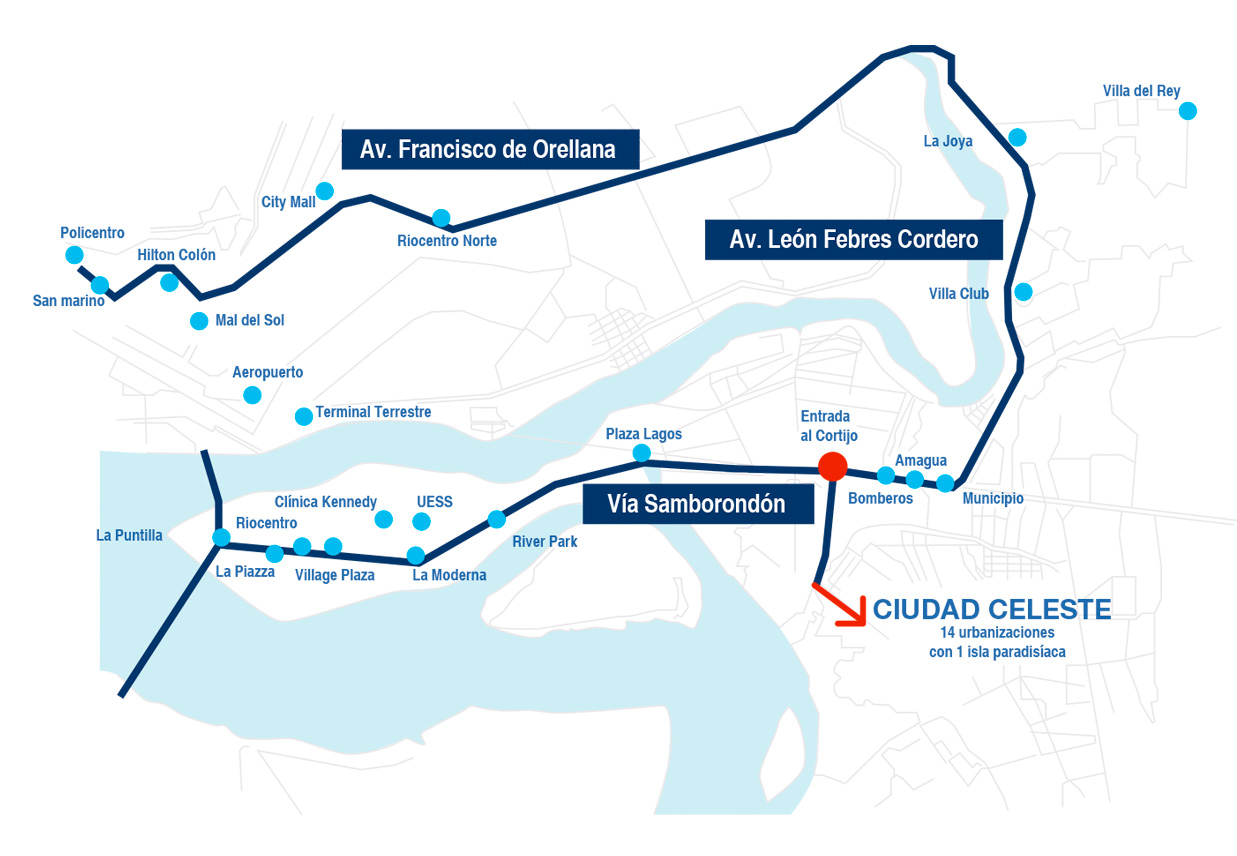 A solamente 8 minutos de Riocentro Entrerios, a 20 minutos del Hotel Hilton Colón por la avenida Francisco de Orellana, y a 30 minutos del Malecón 2000.